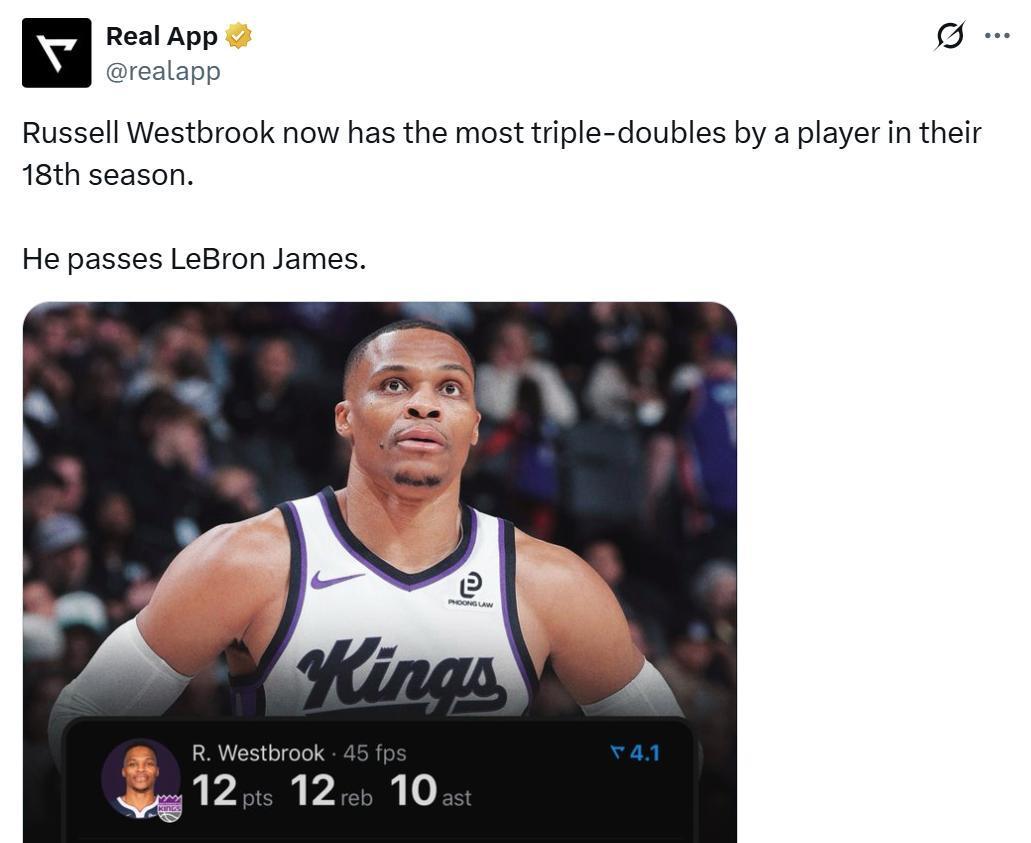 这也是威少生涯第209次拿到三双,继续高居NBA历史第一的同时,又刷新数项NBA历史纪录。