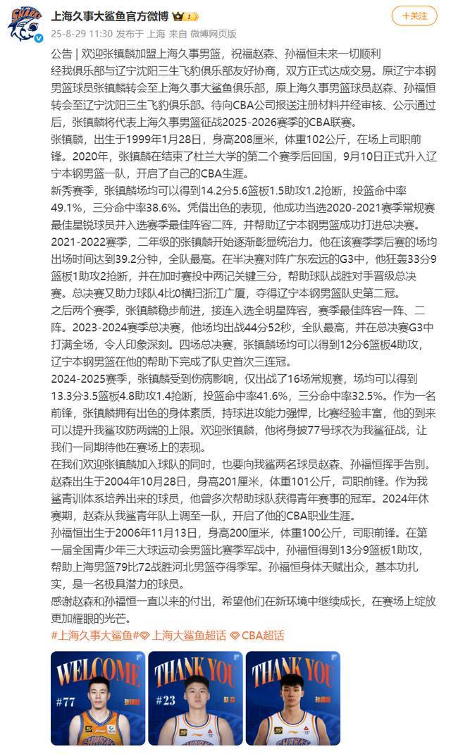 随后,上海久事大鲨鱼官方微博官宣张镇麟加盟。